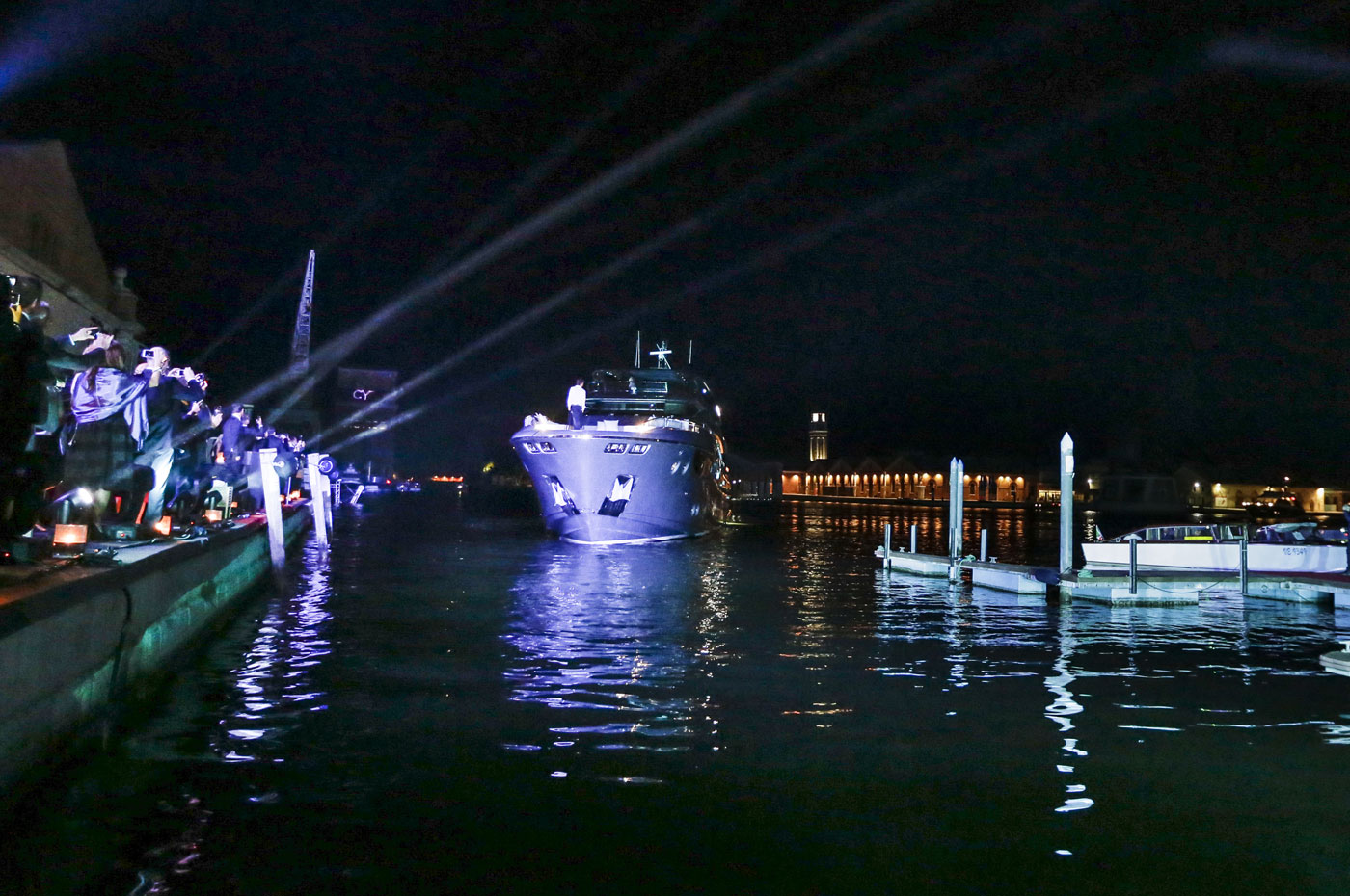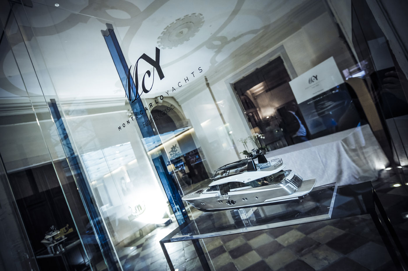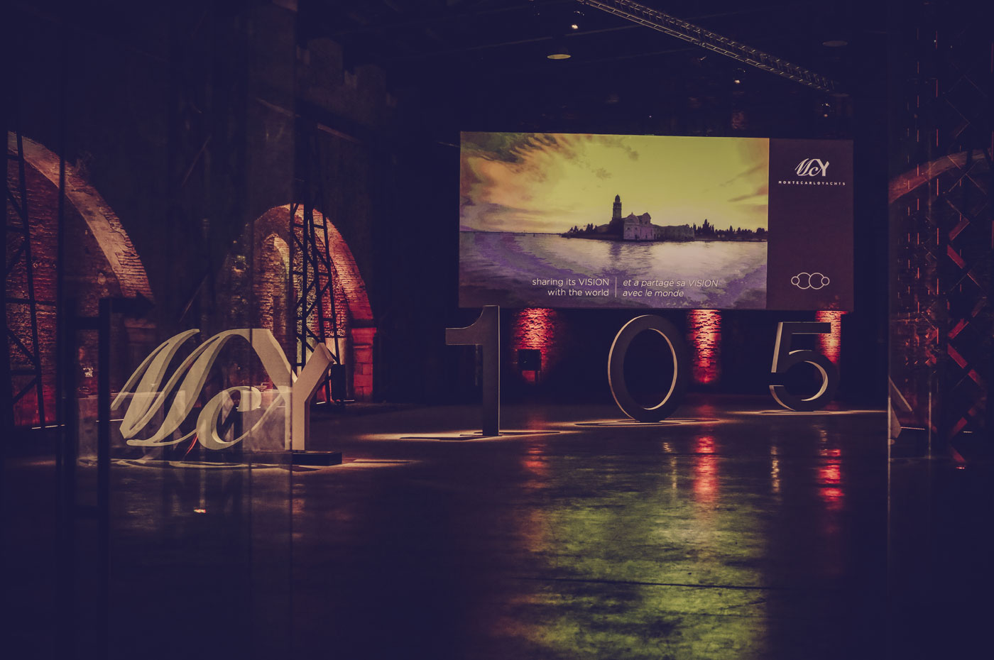 The MCY 105 was presented at a private viewing event for the press and key partners at the Arsenale in Venice. The MCY 105 was the star of a water parade that saw the other models in the MCY collection come together to introduce the newest addition to their number. Projections on a water screen, light shows and laser displays provided the special effects in the magical setting of the Arsenale that over its centuries-long history of craftsmanship and excellence has always been synonymous with innovation and heritage, values that MCY has shared from its very beginnings.
